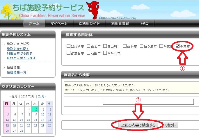 ○画面の「千葉市」を選択し、「上記の内容で検索する」を選択。