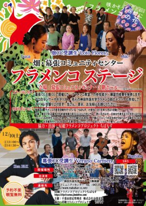 12月10日(土)13:00~16:00 幕張コミュニティセンター 3Fホールにて プロのフラメンコダンサーの踊りは必見です!参加無料で事前申し込みは必要ありません。ぜひ、迫力ある素晴らしい踊りをご覧に来てください。