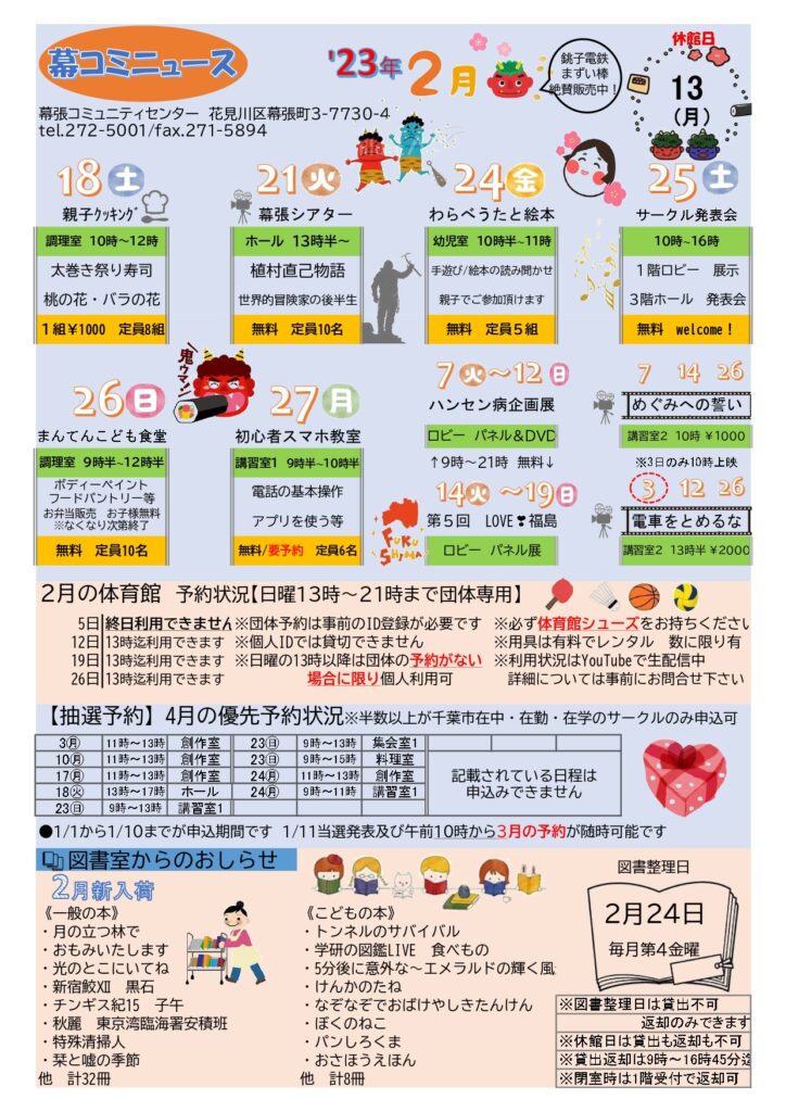 2月もイベント盛りだくさんです。ぜひ幕張コミュニティセンターへお越しください♪