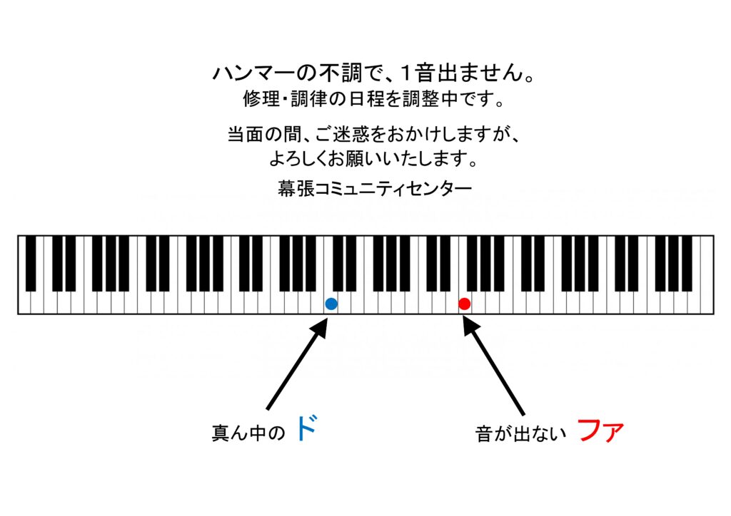いつもご利用ありがとうございます。3F「創作室」のピアノが以下の音源が出なくなり、調律依頼中になります。ご利用者様にはご不便をお掛けしますが、修理まで少しお待ちください。なお、3F「ホール」にもピアノはございます。ピアノのご利用の際は、「ホール」の空き状況にもよりますが、こちらのご利用もご検討ください。何卒よろしくお願い申し上げます。