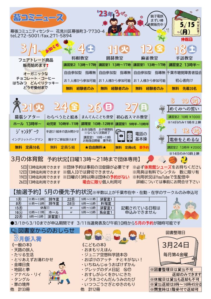 3月もイベント盛りだくさん♪3月1日からは、フェアトレードshopが1F受付前にOPENしました。気候もだんだん暖かくなってきましたので、お天気の日は、幕張コミュニティセンターへぜひお出かけください♪
