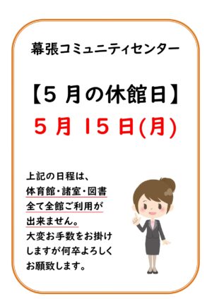 いつもご利用いただき誠にありがとうございます。大変お手数をお掛け致しますが、5/15(月)は、全館清掃の為、ご利用出来ません。何卒よろしくお願い申し上げます。