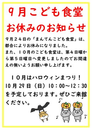 9月24日(日)のまんてんこども食堂はお休みです