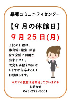 9月25日(月)休館日のお知らせ