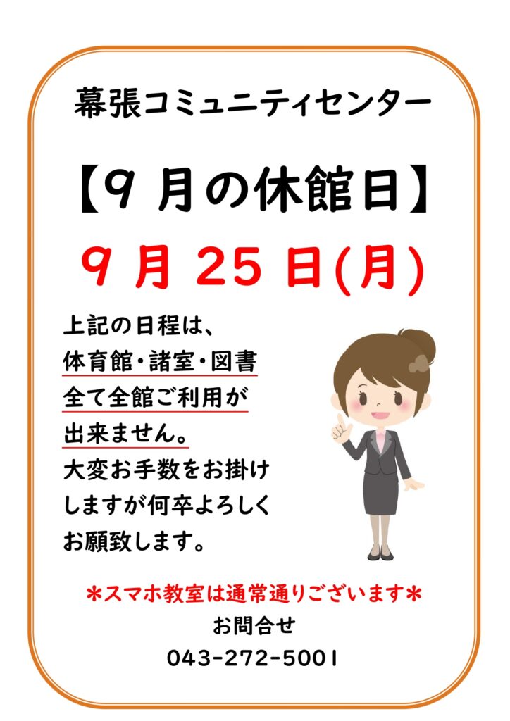 定期清掃の為、9月25日(月)は全館休館になります。ご利用者様にはご不便をお掛けしますが何卒よろしくお願い申し上げます。 ※「スマホ教室」お申込の方へ*9:30~10:30のスマホ教室は、通常通り開催致しますのでご安心ください。