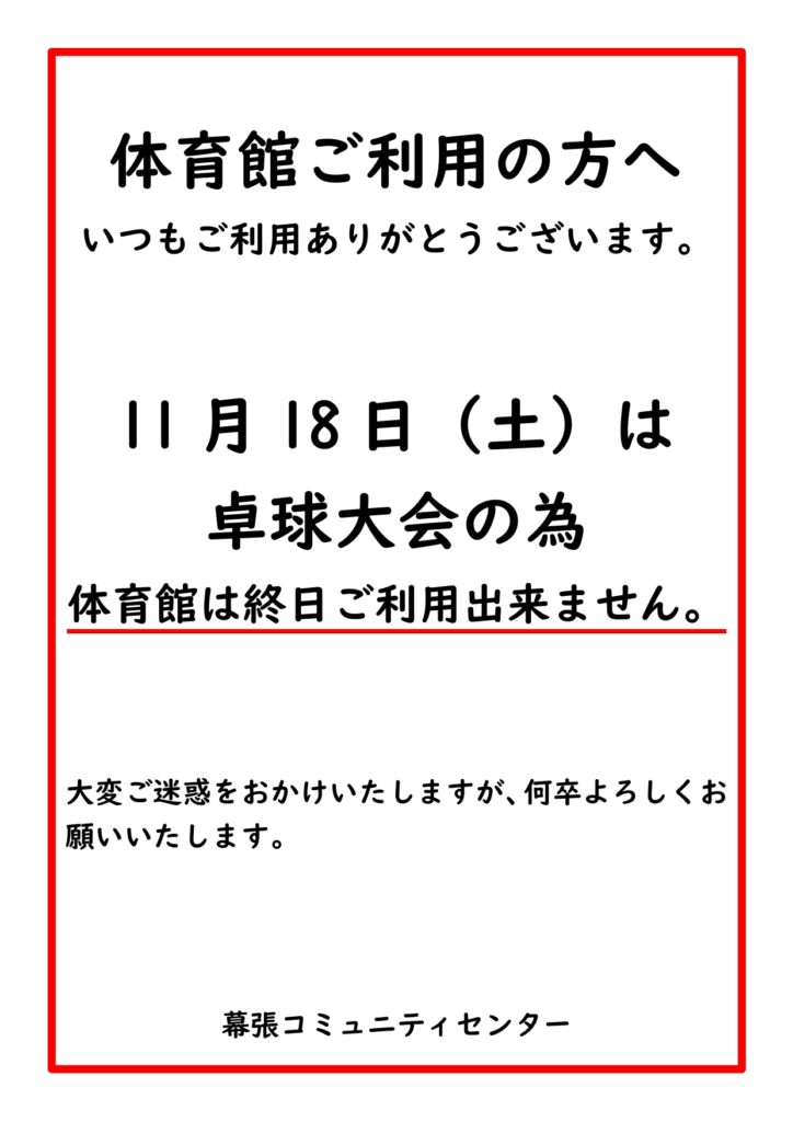 11月18日(土)は、「卓球大会」の為、体育館は終日ご利用出来ません。お手数をおかけしますがよろしくお願いいたします。