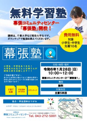 幕張コミュニティセンターでは、月に1回、「幕コミニュース」を作成しております。各種イベント案内、図書室での1月新刊、諸室の抽選予約状況(2か月先)、体育館の使用状況など情報が盛りだくさん。ロビーに掲示、配布しております! […]