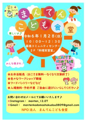 ことしも沢山の笑顔あふれる「まんてんこども食堂」OPENします!第4日曜日、10時~12時30分。幕張コミュニティセンターの2F「料理実習室」にてお待ちしております。子どもたち、あつまれぇ!!