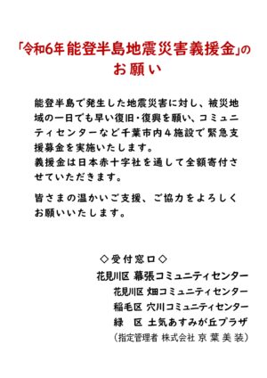 能登半島で発生した地震災害に対し、被災地域の一日でも早い復旧・復興を願い、コミュニティセンターなど千葉市内4施設で緊急支援募金を実施いたします。義援金は日本赤十字社を通して全額寄付させていただきます。皆さまの温かいご支援 […]