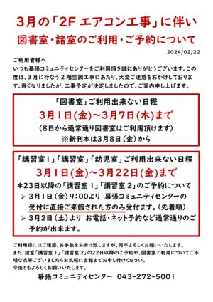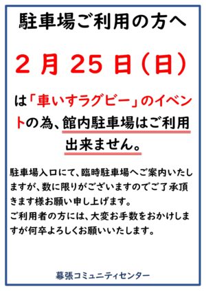 いつも幕張コミュニティセンターをご利用いただきありがとうございます。2月25日は、車いすラグビーのイベントが体育館であり、館内駐車場は、すべて一般のご利用者様は、ご利用出来ません。当日は、駐車場入口にて、臨時駐車場への誘 […]