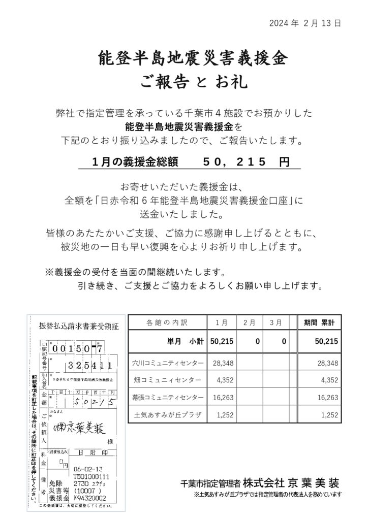 能登半島で発生した地震災害に対し、被災地域の一日でも早い復旧・復興を願い、コミュニティセンターなど千葉市内4施設で緊急支援募金を実施いたします。義援金は日本赤十字社を通して全額寄付させていただきます。皆さまの温かいご支援、ご協力をよろしくお願いいたします。