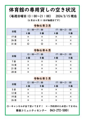 3月31日にキャンセルがでました。体育館半面貸切ご希望の方は、ぜひご利用ください。 予約状況は、日々変わる可能性がございます。必ず、直接、当館へ確認のお電話をお願いいたします。 幕張コミュニティセンター 043-272- […]
