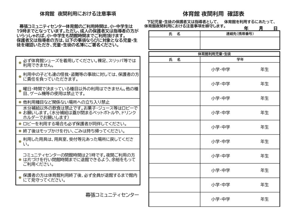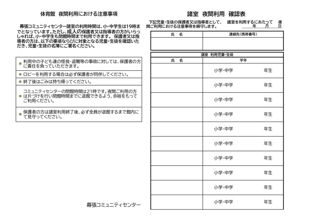 幕張コミュニティセンターでは、体育館、諸室ご利用、その他当館施設のご利用で、小学生以下の者のみで構成されるサークル・団体等又は小学生以下の個人が使用する場合及び中学生以下の者のみで構成されるサークル・団体等又は中学生の個人がご利用する場合、午後7時以降の時間帯については、保護者等の同伴を要するもとしております。