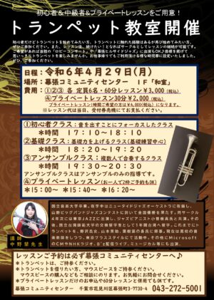 ご好評により、第3弾のトランペット教室を開催いたします。まったくの初心者だけどトランペットを始めてみたい方、トランペットに触れた経験はあるが再び始めてみたい方、ぜひご参加ください。また、レッスン後、続けたい!となればサー […]