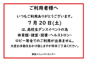 7月20日(土)は高校生ダンスパフォーマンス選手権イベントの為、全館ご利用出来ません。