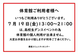 7月19日(金)は13:00~21:00体育館はご利用出来ません。