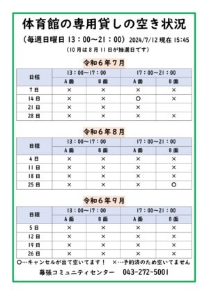 8月・9月の体育館専用貸 予約状況