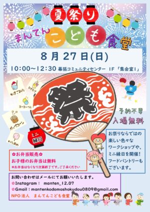 8月25日(日)の「まんてんこども食堂」は、夏祭り~ミニ縁日開催~。ポップコーン、わたあめ、ヨーヨー釣り、かき氷や、お菓子釣り✿楽しいイベント満載です。夏休み最後の日曜日は、幕張コミュニティセンターへ。10時から開催です […]