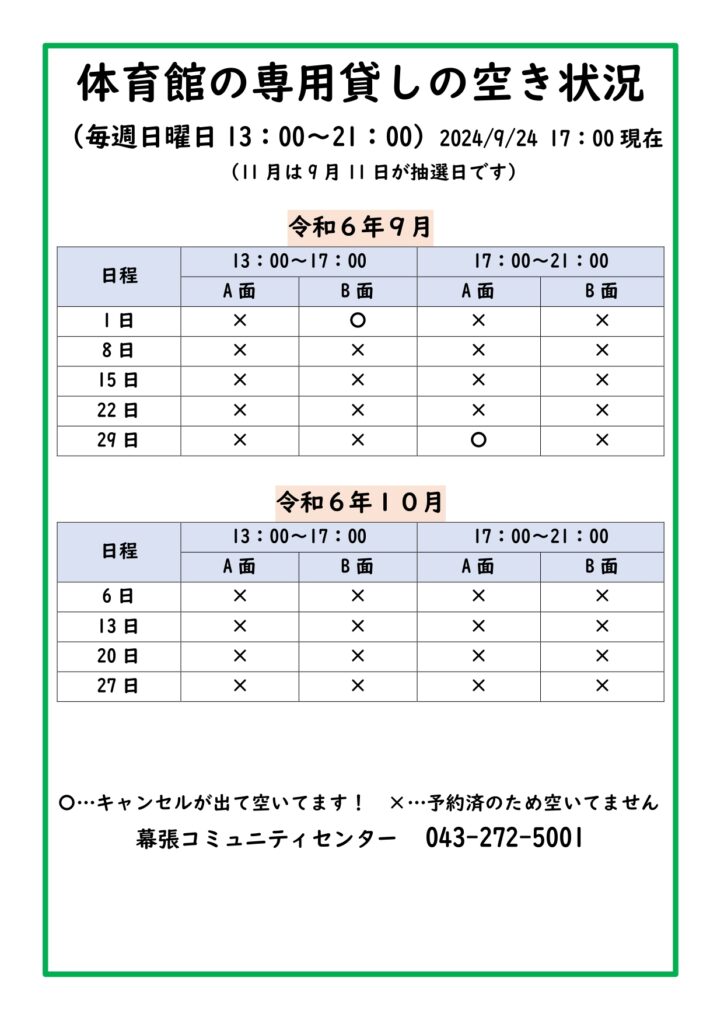 体育館専用使用9/29(日)が空きました!