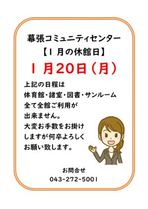 いつもご利用ありがとうございます。20日は定期清掃の為、休館日ですので、幕張コミュニティセンターはご利用頂けません。大変ご迷惑をおかけいたしますがよろしくお願いいたします。