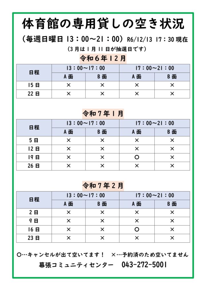 体育館専用使用R7.2/16(日)が空きました!