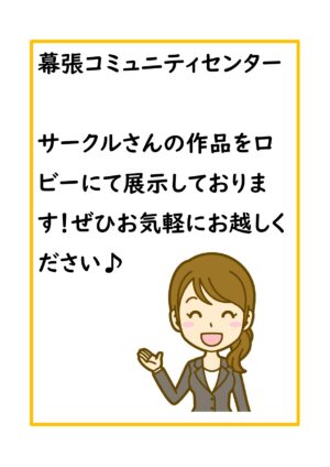 幕張コミュニティセンターで活動されているサークルさんの作品を1Fロビーと2Fロビーにて展示しております。当館で活動されているサークルさん、展示のご希望がございましたら受付にご相談ください♪