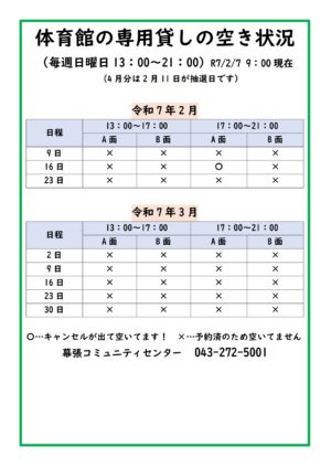 キャンセルが出たため、体育館専用貸し(団体)の予約ができるようになりました。 2月16日(日) 17時~21時 A面 どうぞご利用ください。