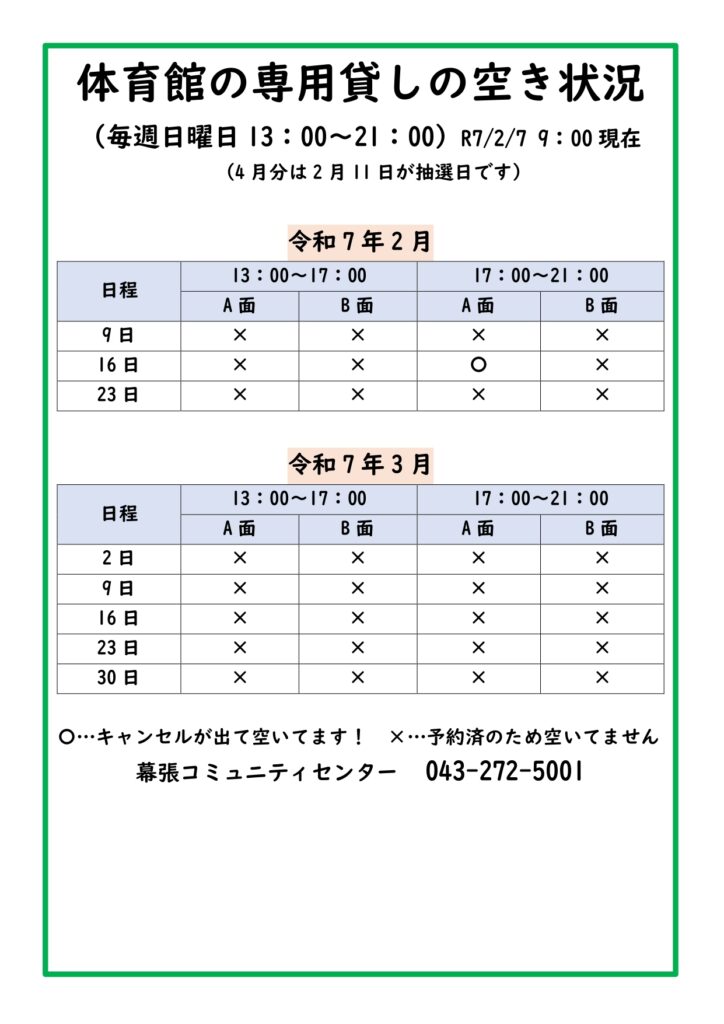 キャンセルが出たため、体育館専用貸し(団体)の予約ができるようになりました。