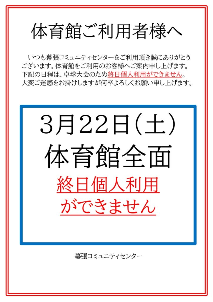 3/22(土)は、卓球大会のため個人利用はできません。