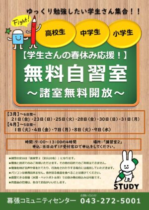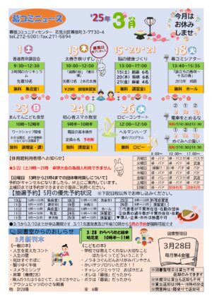 幕張コミュニティセンターでは、月に1回、「幕コミニュース」を作成しております。各種イベント案内、図書室での 3月新刊、諸室の抽選予約状況(2か月先)、体育館の使用状況など情報が盛りだくさん。ロビーに掲示、配布しております […]