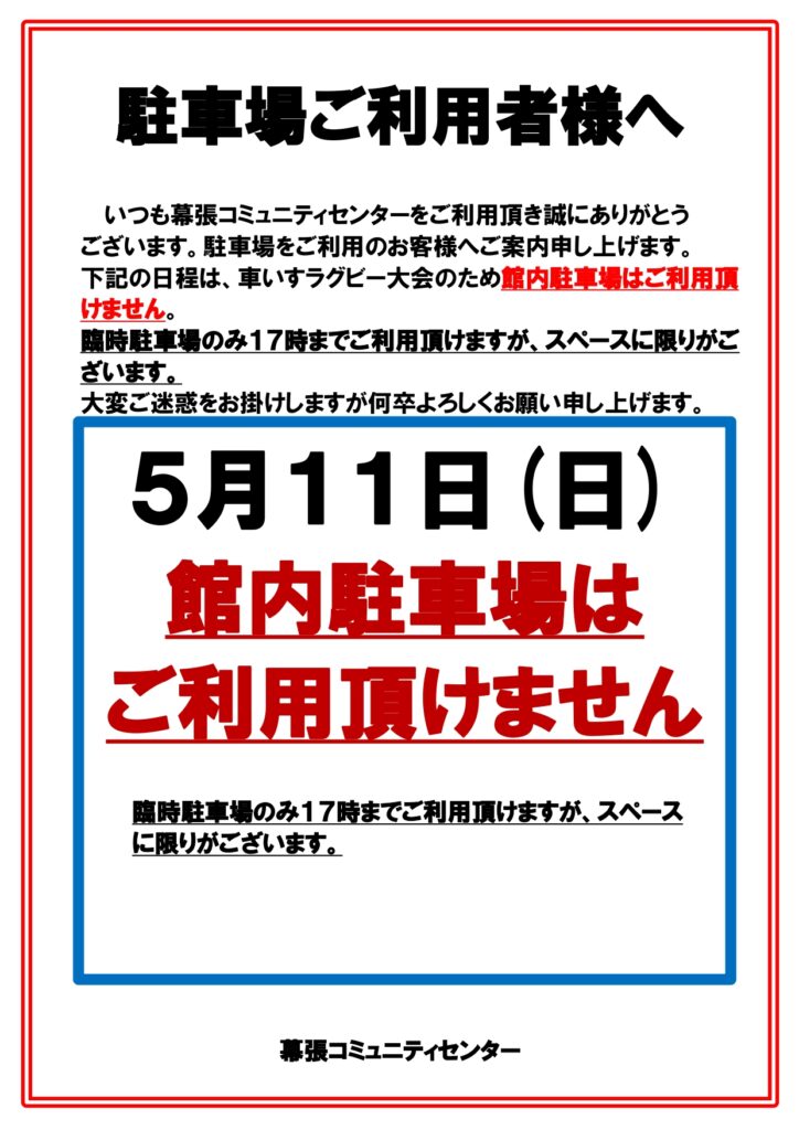 5月11日(日)は、車いすラグビー大会のため、館内駐車場はご利用頂けません。なお臨時駐車場は17までご利用頂けますが、スペースに限りがございます。大変ご迷惑をおかけいたしますが、ご了承の程よろしくお願い申し上げます。