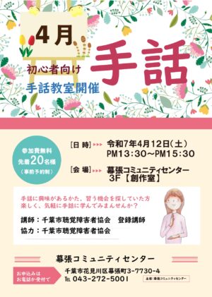 手話に興味があるかた、習う機会を探していた方、楽しく、気軽に手話を学んでみませんか?参加無料。先着20名。事前予約制です。*4/7現在、定員に達しました。キャンセル待ちご希望の方は、幕張コミュニティーセンターまでお問い合 […]