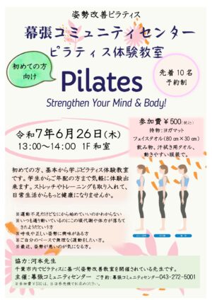 初めての方、基本から学ぶピラティス体験教室です。学生から年配の方まで気軽に体験できます。ストレッチやトレーニングも取り入れて、日常生活からもっと健康になりませんか?先着10名予約制。参加費500円。持ち物:ヨガマット、フ […]