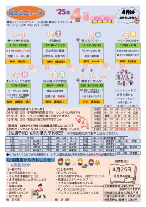 幕張コミュニティセンターでは、月に1回、「幕コミニュース」を作成しております。各種イベント案内、図書室での 4月新刊、諸室の抽選予約状況(2か月先)、体育館の使用状況など情報が盛りだくさん。ロビーに掲示、配布しております […]