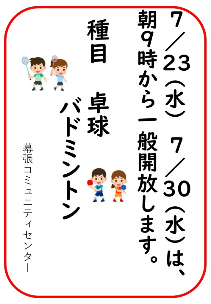 7/23(水)、7/30(水)は、9時から体育館の一般開放を行います。種目は、卓球とバトミントンになります。