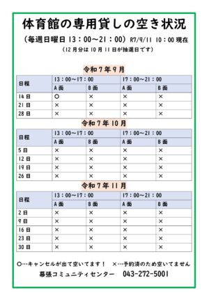 9月14日(日)体育館A面13時から17時の枠が、キャンセルのため空きがあります。どうぞご利用ください。この情報は、9月11日10時現在の情報です。