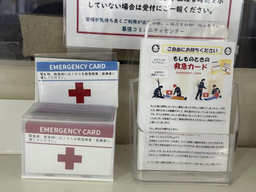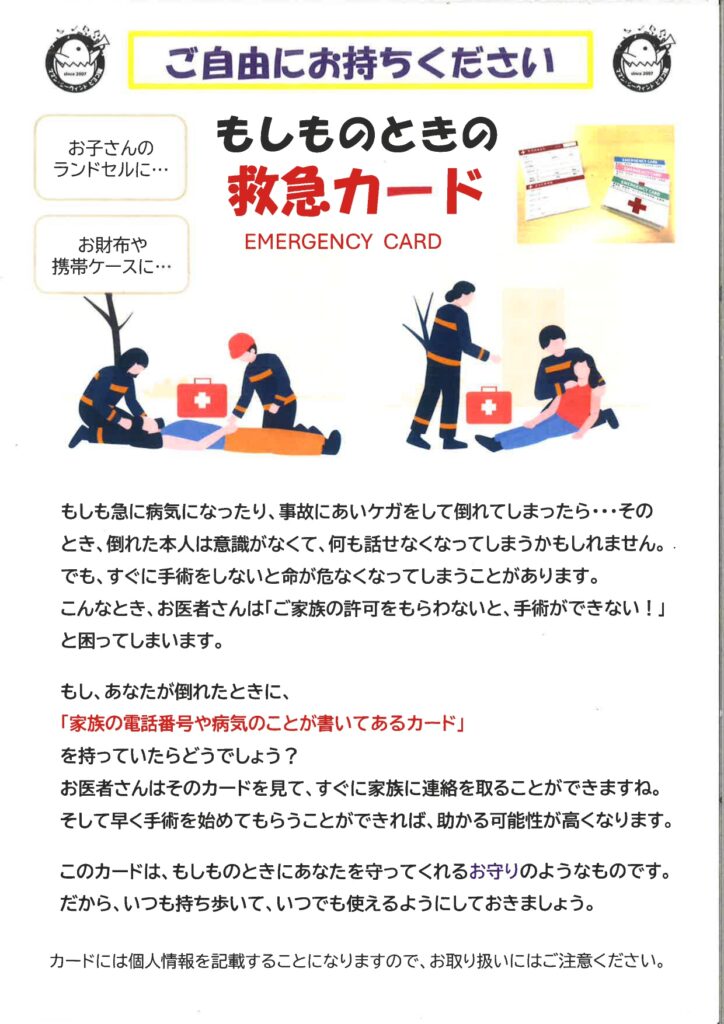 幕張コミュニティセンターの音楽サークル「ママン・シーウィンド ピヨコ隊」の皆さんが、「もしものときの救急カード」を制作されました。いざという時の家族への連絡カードです。