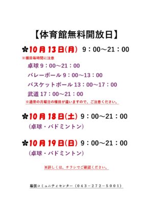 明日(10/13・スポーツの日)は、体育館を無料開放します!10/18(土)、10/19(日)も!!!