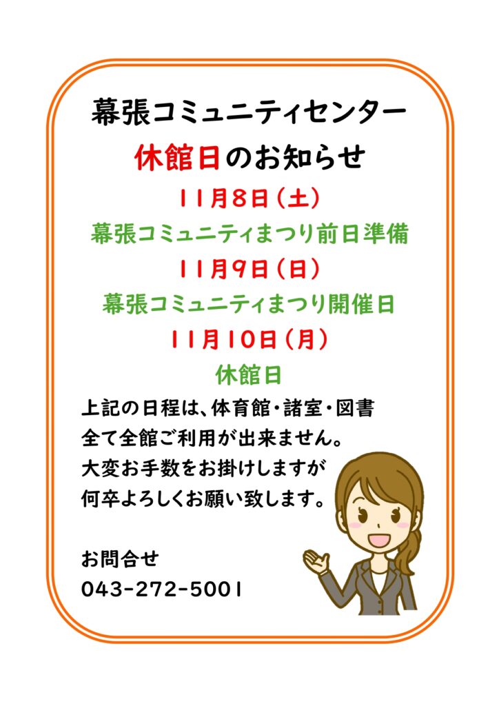 11月8日・9日はコミュニティまつりのため、10日は定期清掃のため、全館休館になります。ご利用者様にはご不便をお掛けしますが何卒よろしくお願い申し上げます。