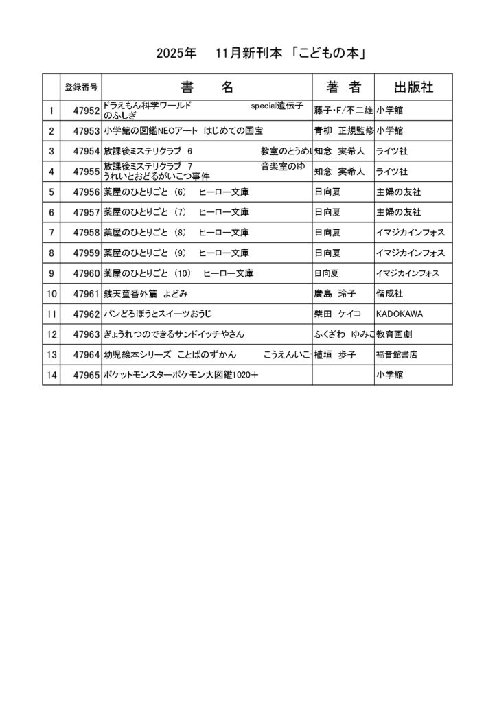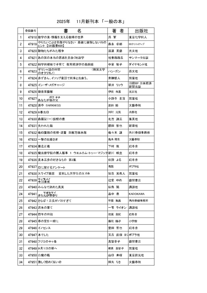 11月の新刊のご案内です。話題の新刊、ご要望のあった新刊が入荷しています。この機会に図書室にお立ち寄りください。