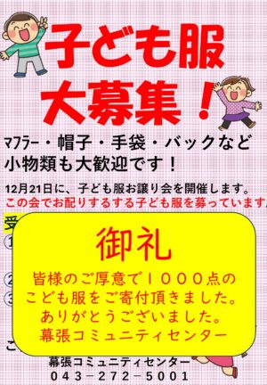本日(12月21日)開催の「こども服お譲り会」へ子ども服を寄贈頂きました皆様、ありがとうございました。おかげさまで、約1000点のこども服が集まり、大勢の方に子ども服をお渡しすることができました。参加いただいた皆様もとて […]