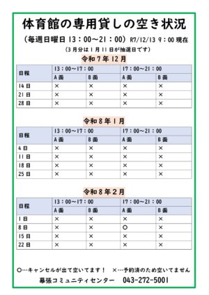 2026年2月8日(日)体育館専用貸しにキャンセルが出ました。体育館A面 17時~21時 2025年12月13日9時現在の情報です。予約の際は、受付または予約システムにご確認ください。