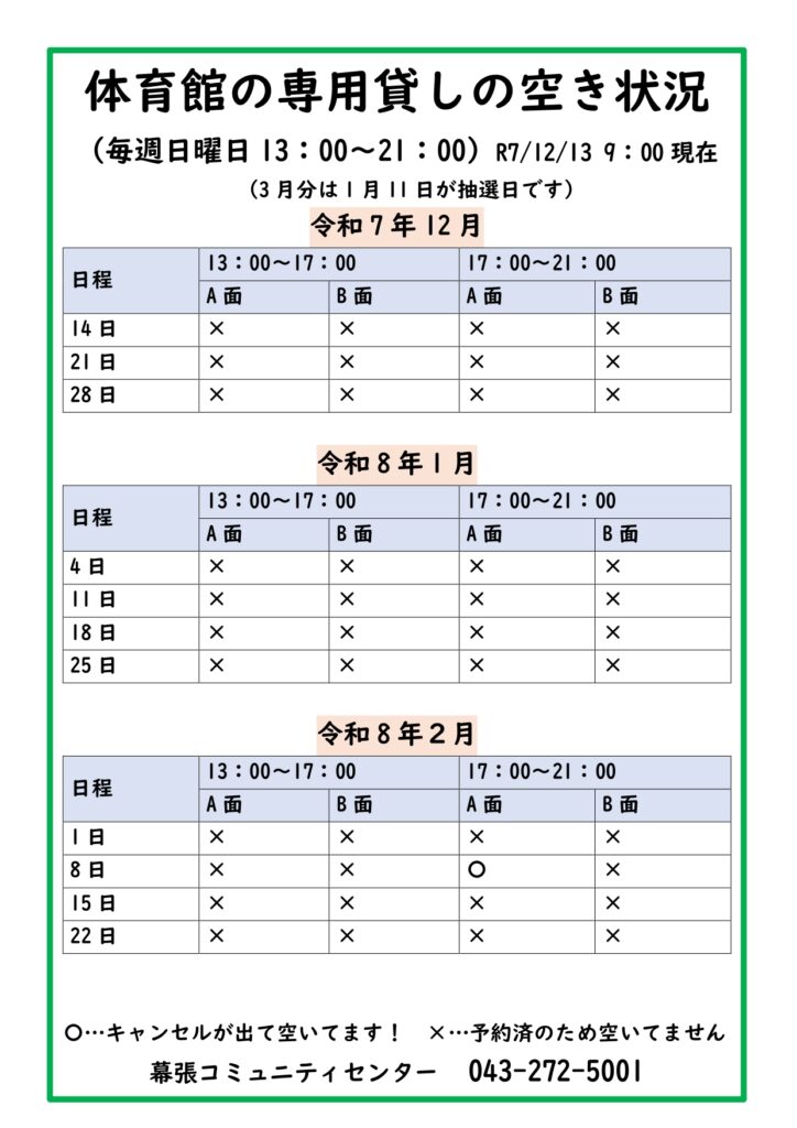 2026年2月8日(日)体育館専用貸しにキャンセルが出ました。
