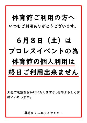 6月8日は個人利用のスポーツ(卓球、パトミントン)体育館のご利用ができません。大変ご迷惑をおかけいたしますが何卒ご了承ください。幕張コミュニティセンター