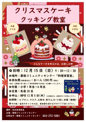 大人気の教室、クリスマスケーキをつくります。どんなケーキをつくるかはお楽しみ。対象は小学生です。今回は、キャンセル待ちになりました。よろしくお願いいたします。