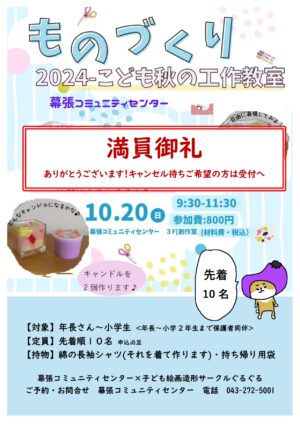 10月20日(日) 2024こども秋の工作教室「キャンドル作り」≪満員御礼!!≫