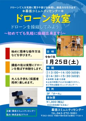 大人も子供も(小学生低学年は保護者様同伴をお願いします)楽しめます。実際にドローンを操縦してみましょう!ご予約は幕張コミュニティセンターへ 参加費用は¥2000です♪