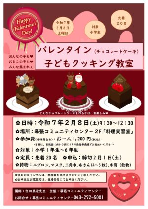 令和7年2月8日(土)バレンタイン子どもクッキング教室開催!数名空きがあります!