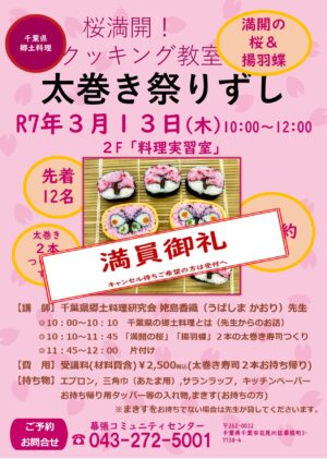 お待たせしました大人気クッキング教室「太巻き祭りずし」を今年も開催します。千葉県の郷土料理、「満開の桜」「揚羽蝶」2本の太巻き寿司を作ります。今回は大人の皆さんが対象です。お花見のお供に作ってみませんか?先着12名。2月 […]