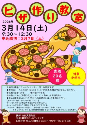 大人気の教室、今回はピザをつくります。どんなピザをつくるかはお楽しみ。対象は小学生です。要予約、参加費1,200円、先着20名、対象は小学生。詳しくはチラシをご覧ください!